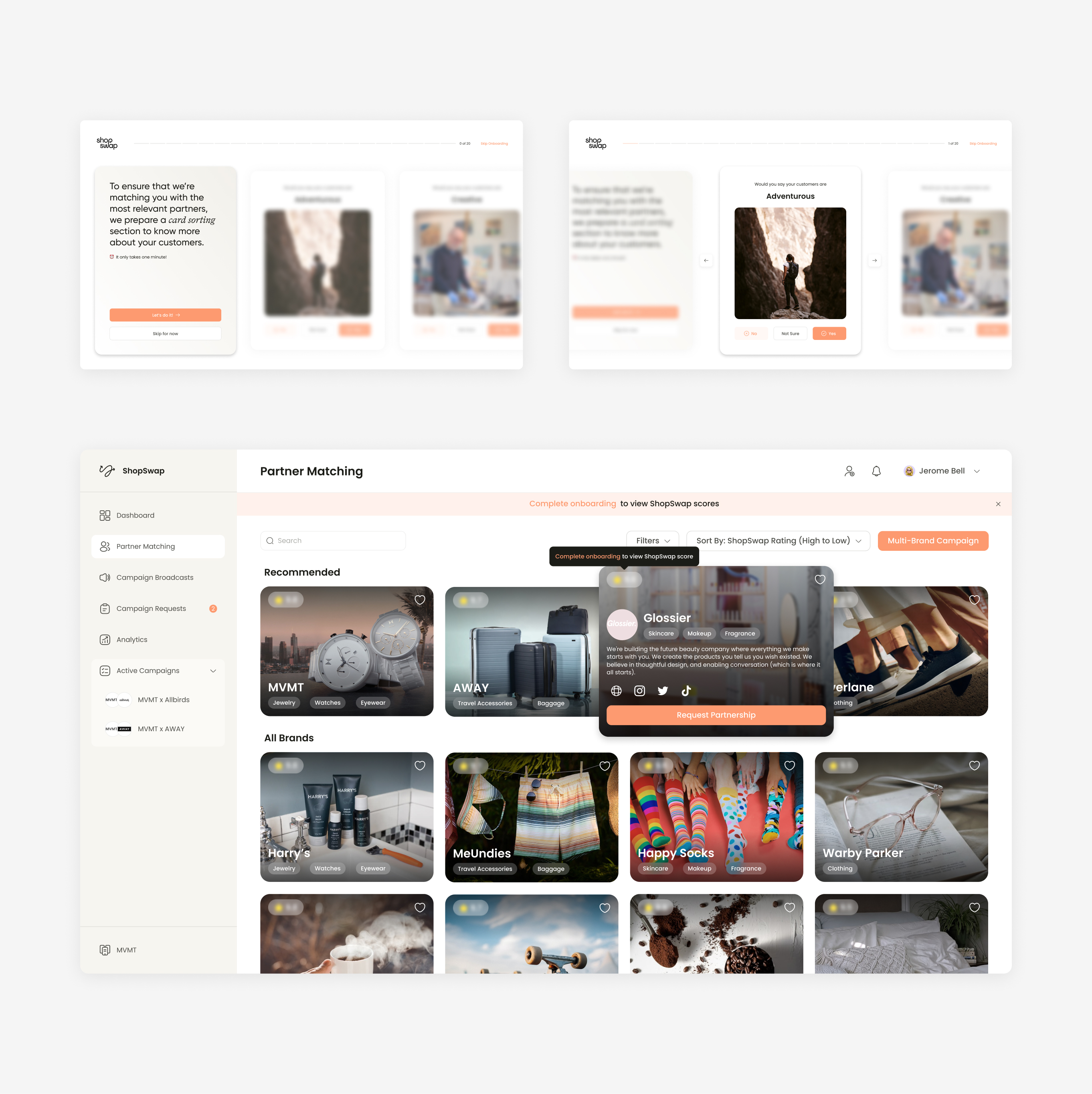 To provide a better brand-matching experience, we created ShopSwap Scores, which use our algorithm to indicate how well a brand aligns with yours. However, the algorithm requires brands to provide detailed information during onboarding, which can extend the process and discourage users from completing it.