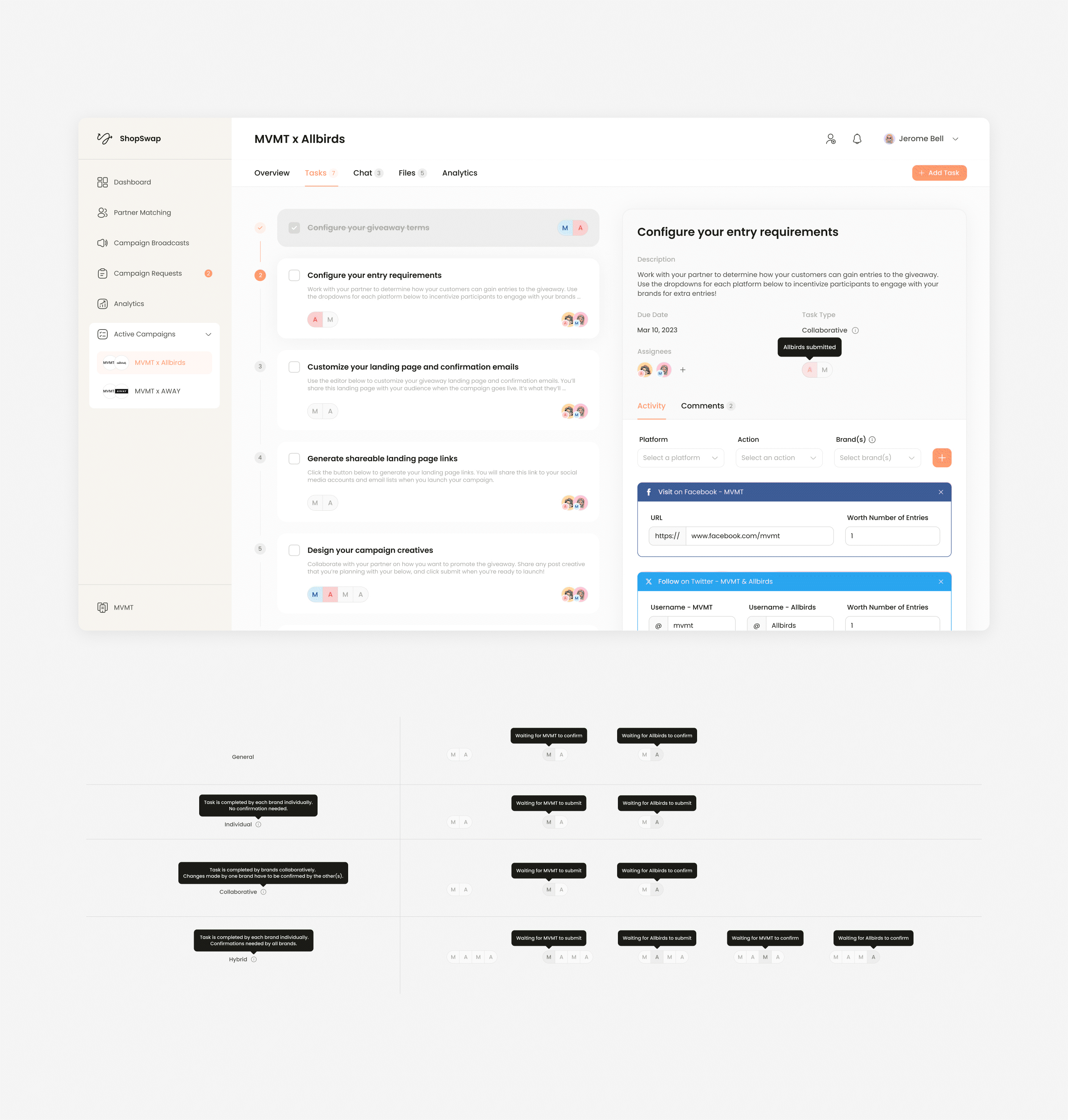 - After user testing, we discovered that one brand typically does most of the work, while the other mainly just confirms. As a result, we removed the restrictions and dependencies between tasks, allowing brands to move on to the next task without having to wait for the other brand to take action. This enhances the continuity of the workflow and reduces the bounce rate.